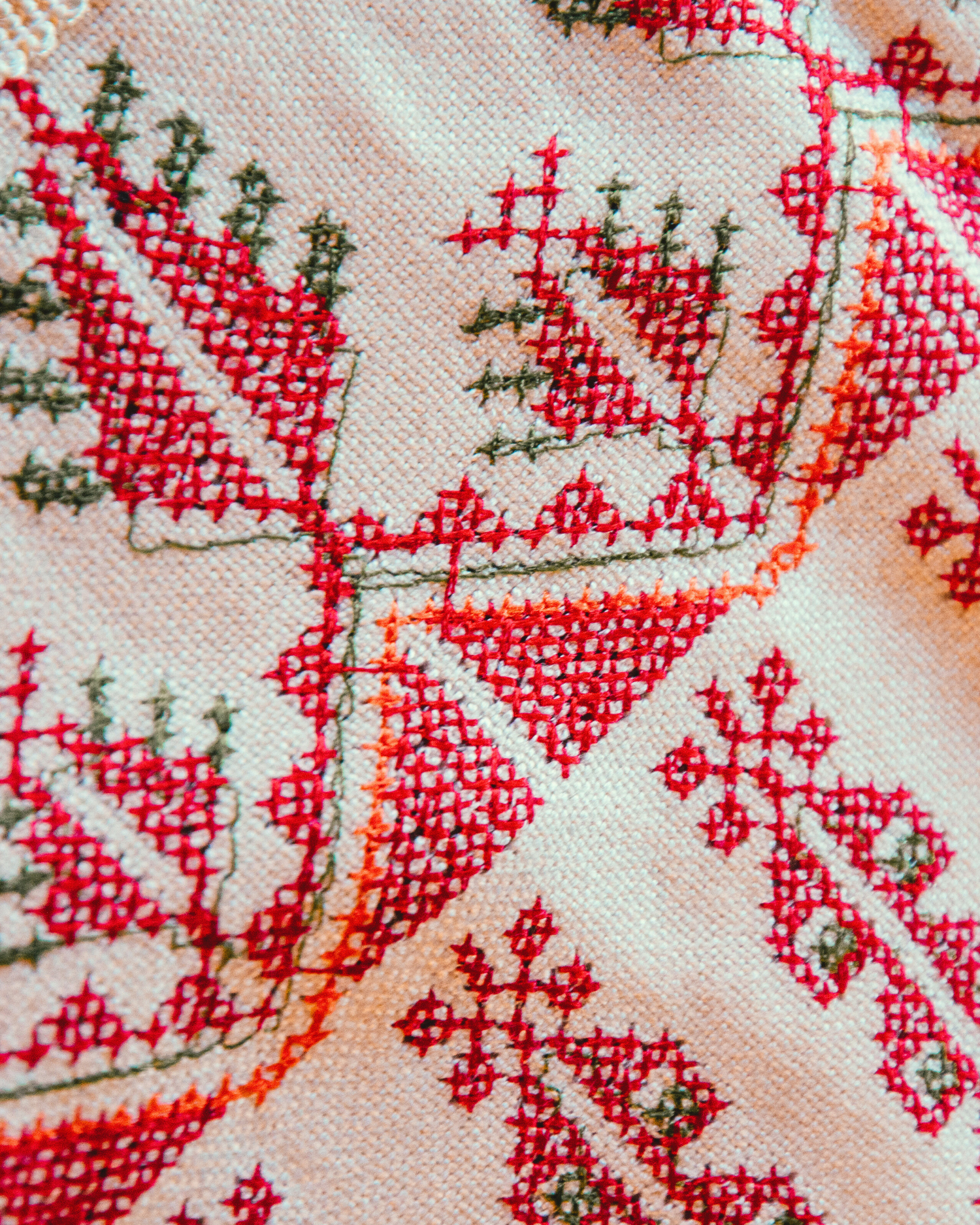 Machine-stitched tatreez refers to items stitched by either a human-operated machine or an industrial one. This type of stitching is helpful for creating more intricate designs in less time, serving an advantage that hand-embroidery cannot offer. The tell tale signs that an item is machine-stitched are: