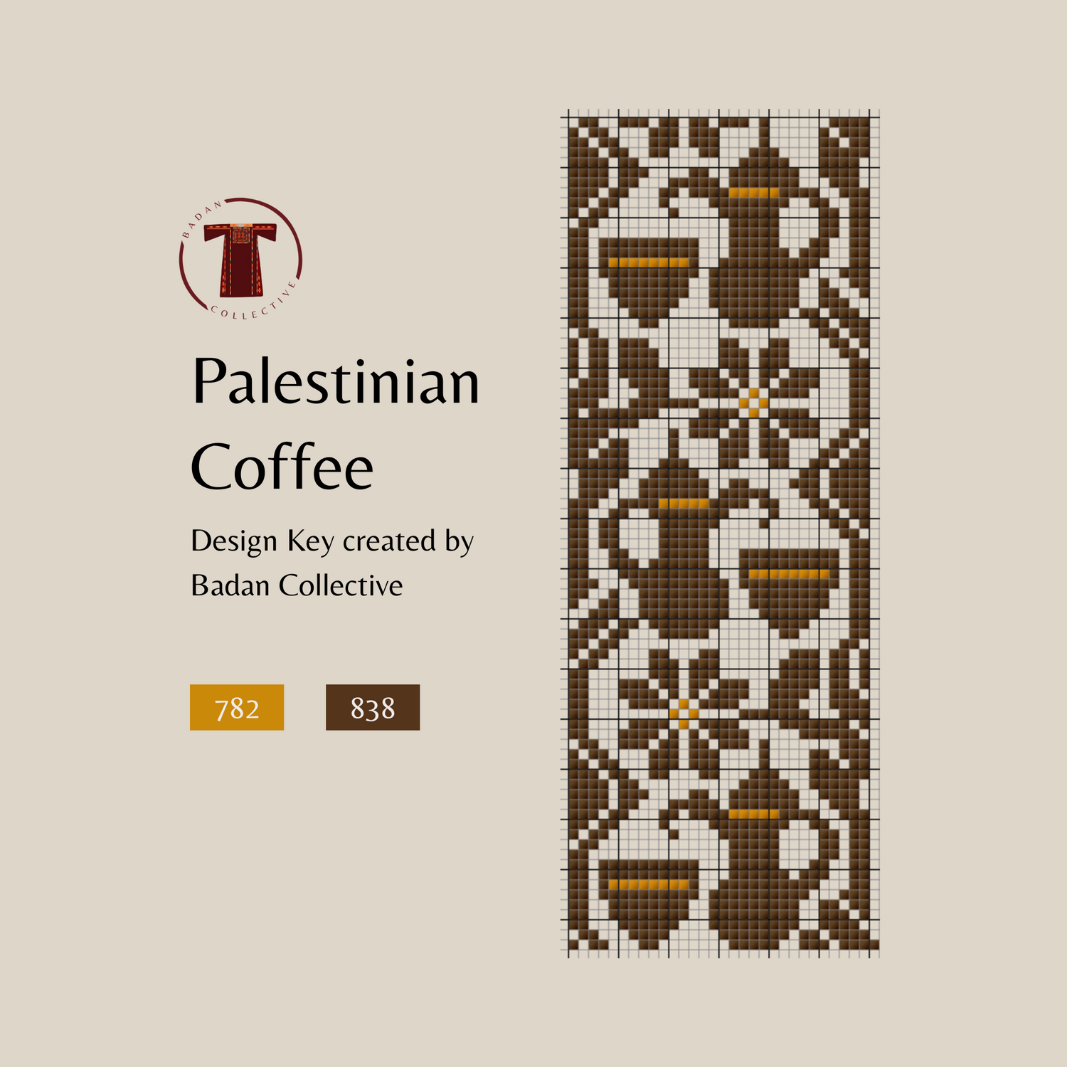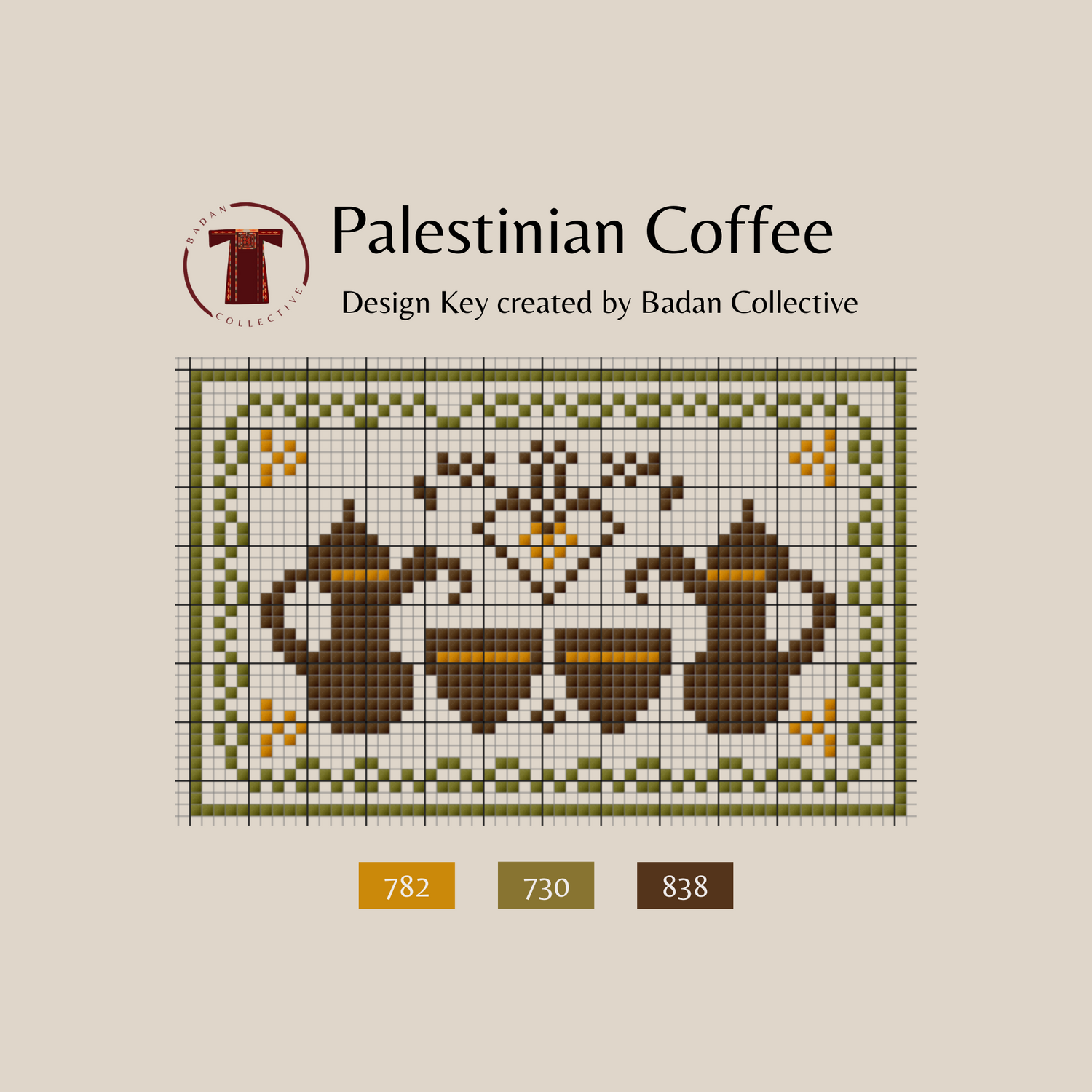 This design was digitized from a thobe that is estimated to have been created between 1980-2000. It is a pattern depicting coffee cups and kettles. The credit for this artwork goes to a Palestinian from our community who is, as of now, nameless. However, we recognize the original artist's work, regardless of whether we know her name or not, and encourage all stitchers to do the same.