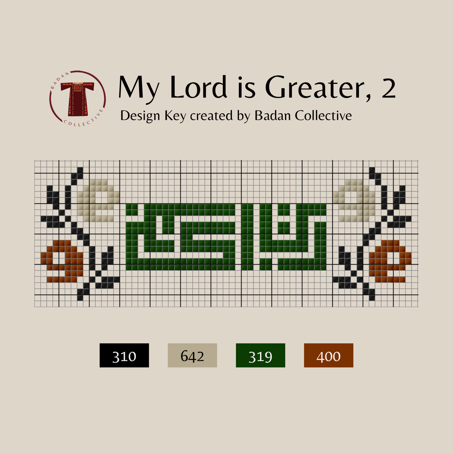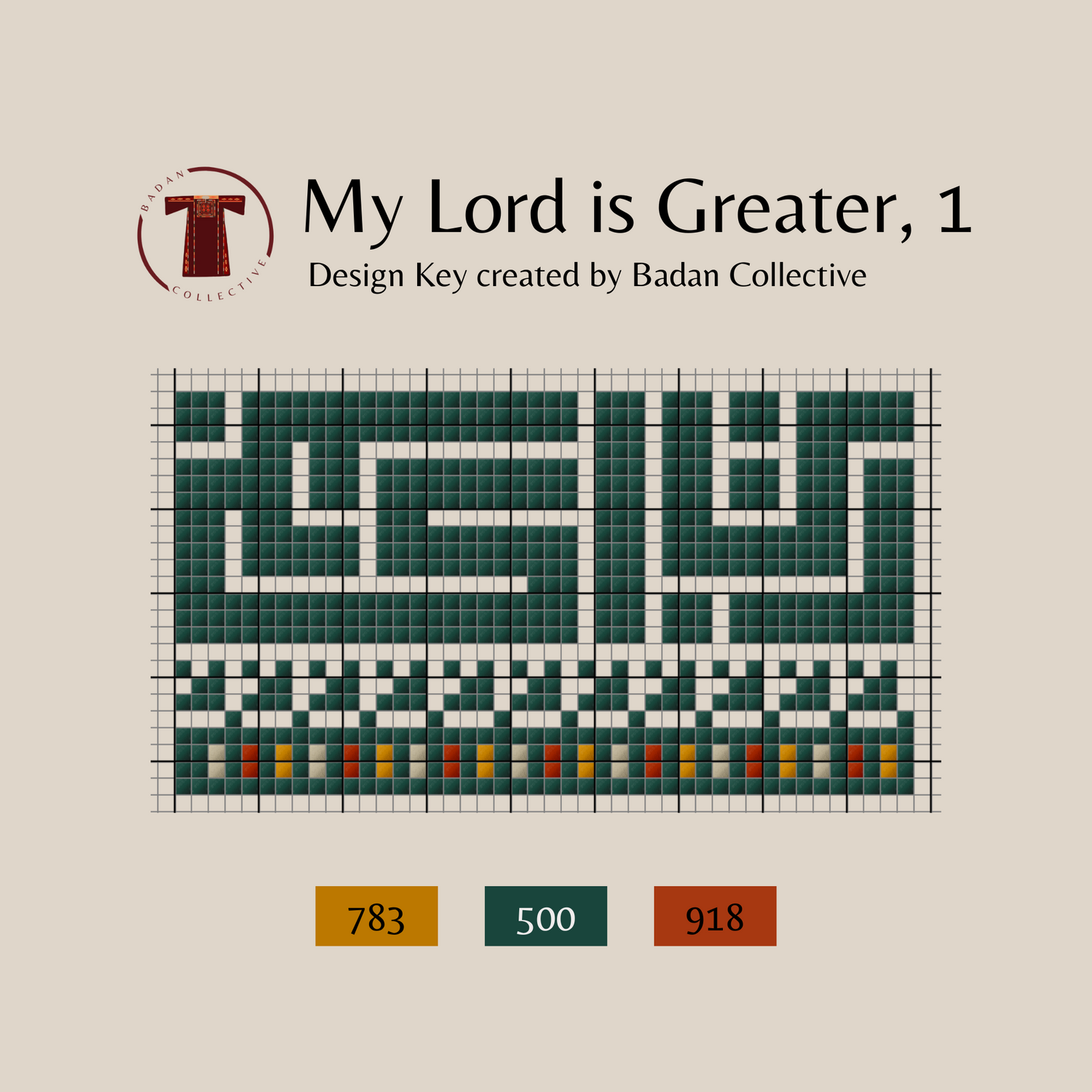 This design incorporates Arabic calligraphy that translates to "My Lord is Greater." The motifs on the bottom are border motifs previously used to decorate the skirt or chest panels of Palestinian dresses.
