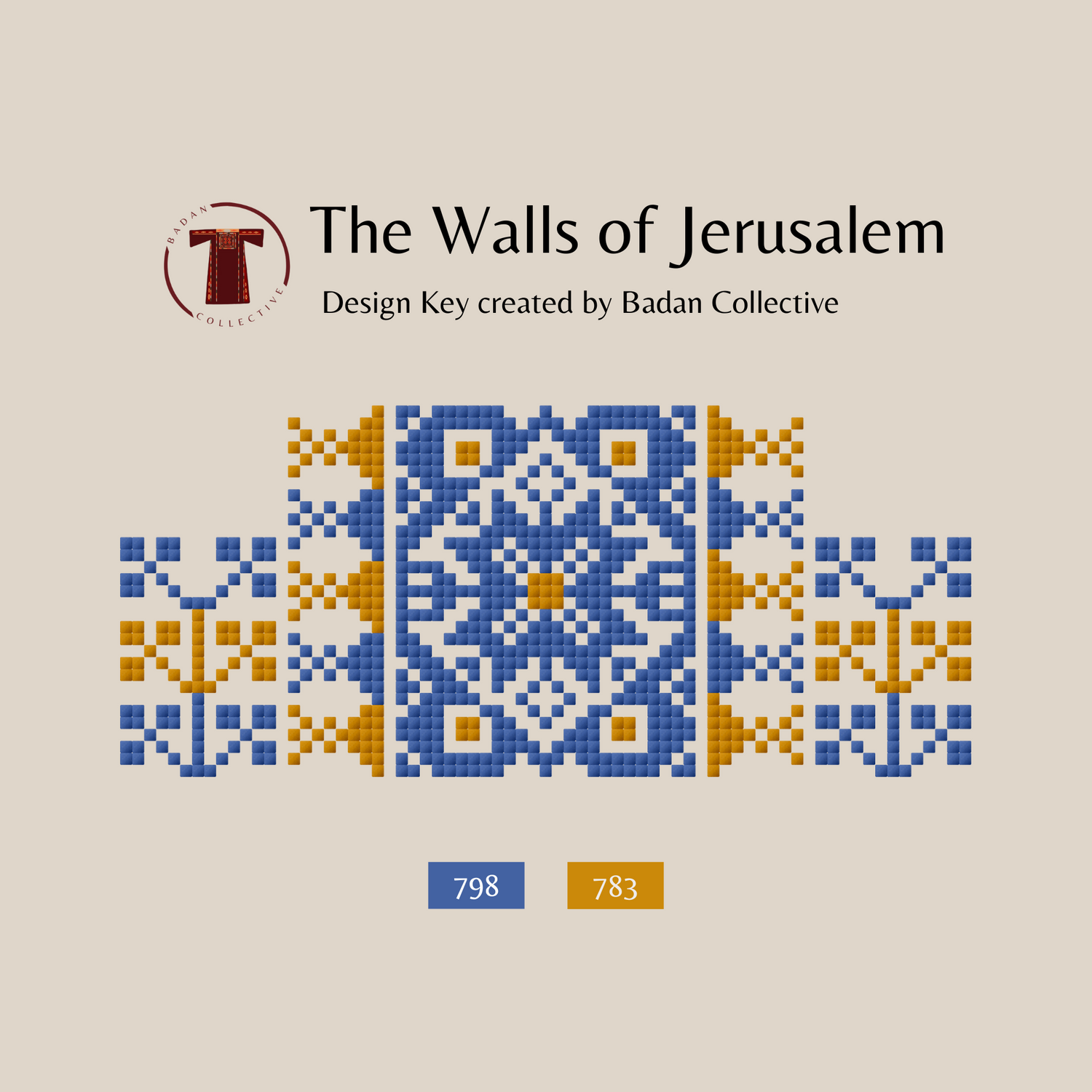 This pattern incorporates motifs originating from Jerusalem including the "Haram Tiles" found in the middle of the design, "Walls of Jerusalem" border motif, and the "Love Tree" motif found on the edges of this pattern.
