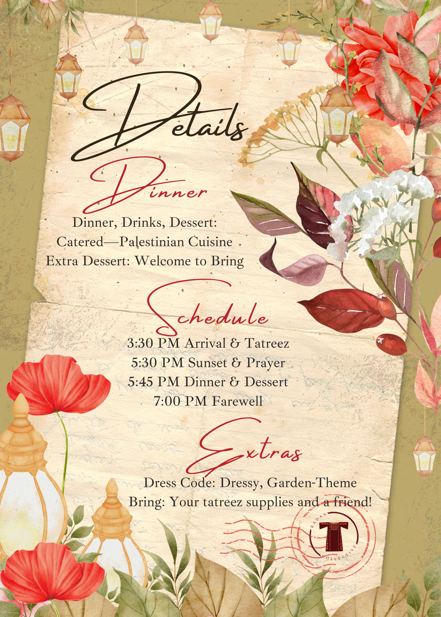 Dear Stitcher, you're cordially invited to our garden-themed Badan Iftar—the third annual and biggest yet! Dinner is catered, space is created, and time is allocated. All that's left is for you to grace us with your presence and enjoy an evening of tatreez, reflection, and community. *This event is one of The Badan Village's monthly tatreez circles in combination with a Ramadan Iftar. All are welcome to join!