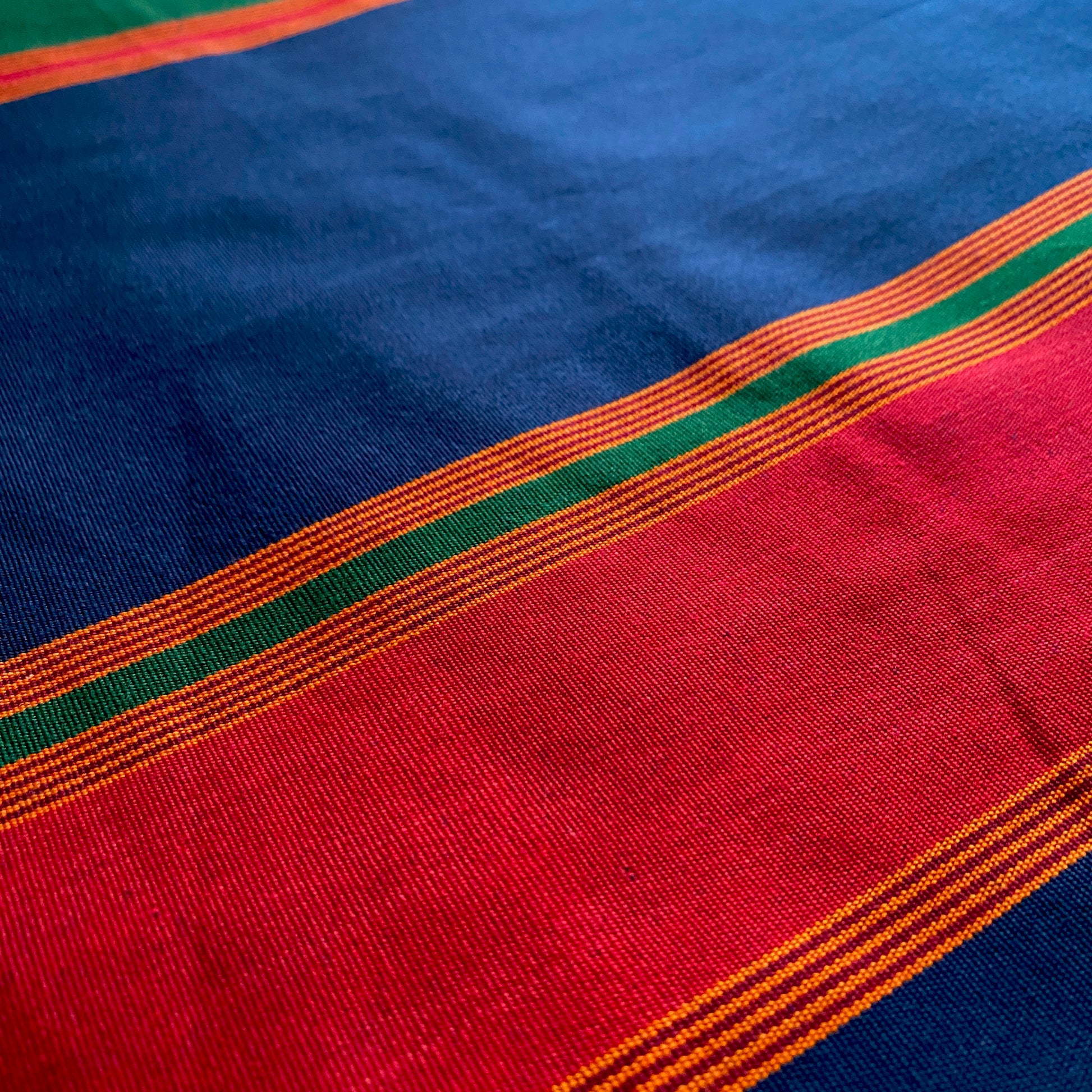 This Majdalawi fabric is a cotton blended weave (stiffer than a pure cotton blend). Originally, Majdalawi fabric was woven in a city north of the Gaza region called Majdal. Since Majdal's ethnic cleansing during the Palestinian Nakba in 1948, many families from the town were displaced into the Gaza strip and are now fighting, not only an ethnic cleansing of their people, but of their arts. During less turbulent situations, these families usually weave this fabric and export it to Ramallah for sale and distribution. With the current genocide, it is difficult to source these fabrics directly from families in Gaza. The Majdalawi fabric photographed is woven in Syria and sourced directly from Palestine.