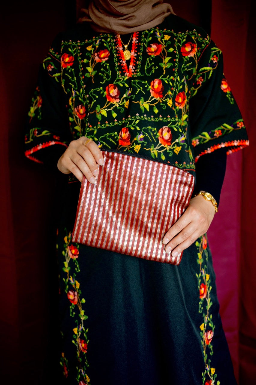 Saya Fabric is woven from silk (or a silk and cotton blend). It was historically used in traditional dresses across the region–Palestine, Syria, and Jordan alike. This practice is still upheld today. Saya is also used to create many beautiful accessories and home items including items like this pouch. By bringing and using it in your daily life, you bring a piece of Palestinian and Syrian culture to life.